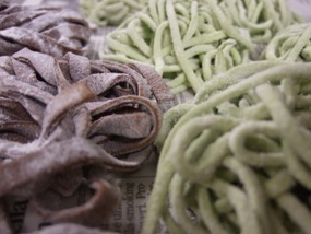 左はココアを練り込んだ生地です。 形はタリアテッレ。生地を薄くのばして、約1cm幅に切ったものです。